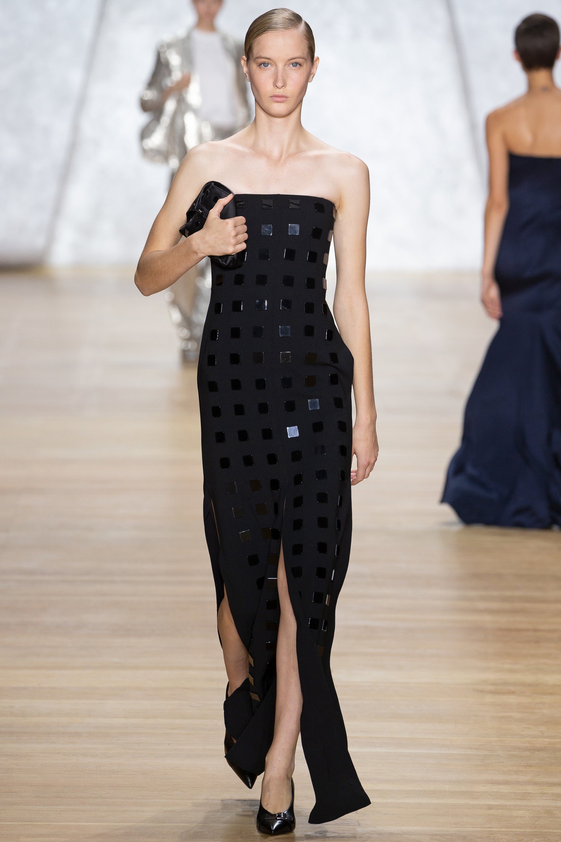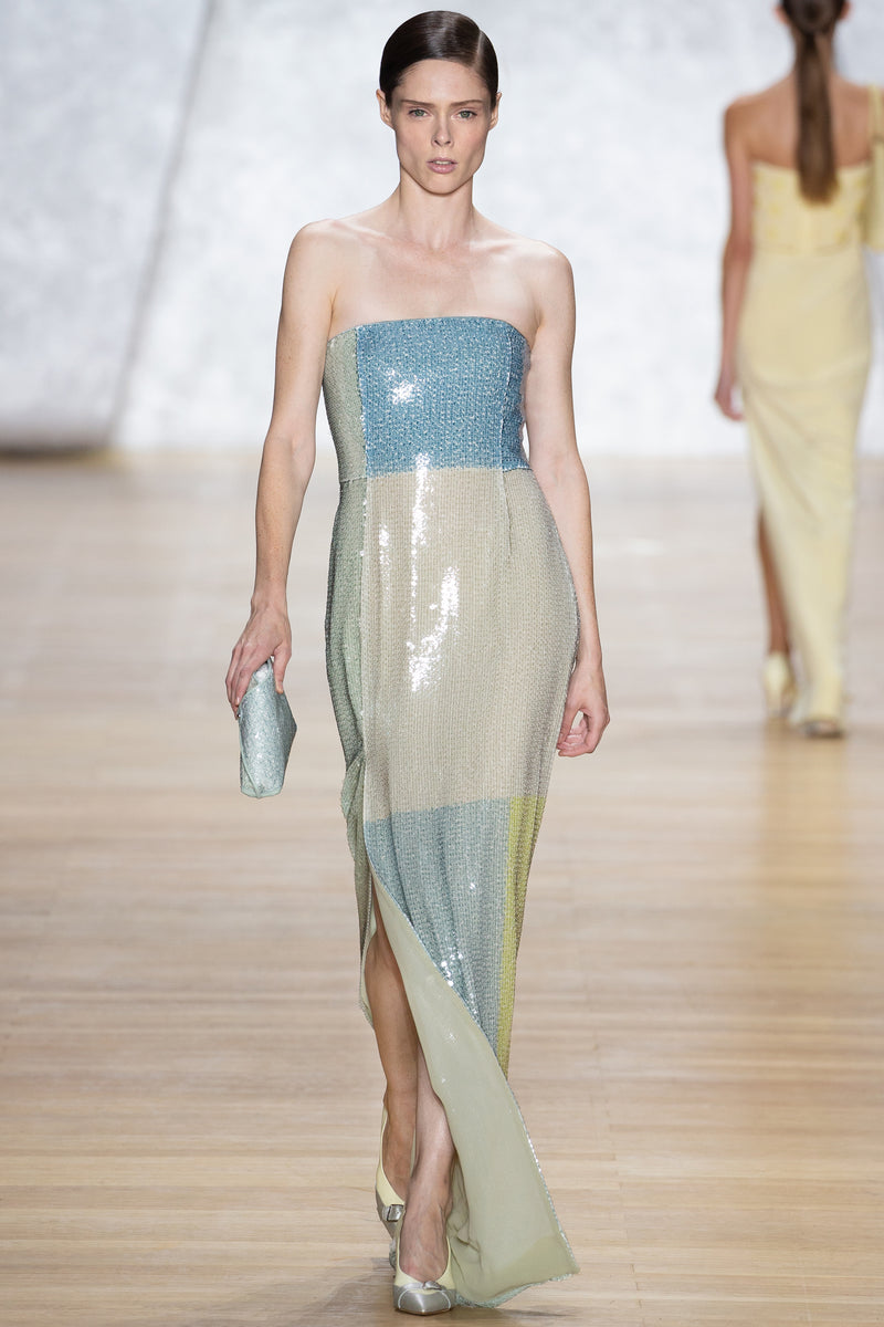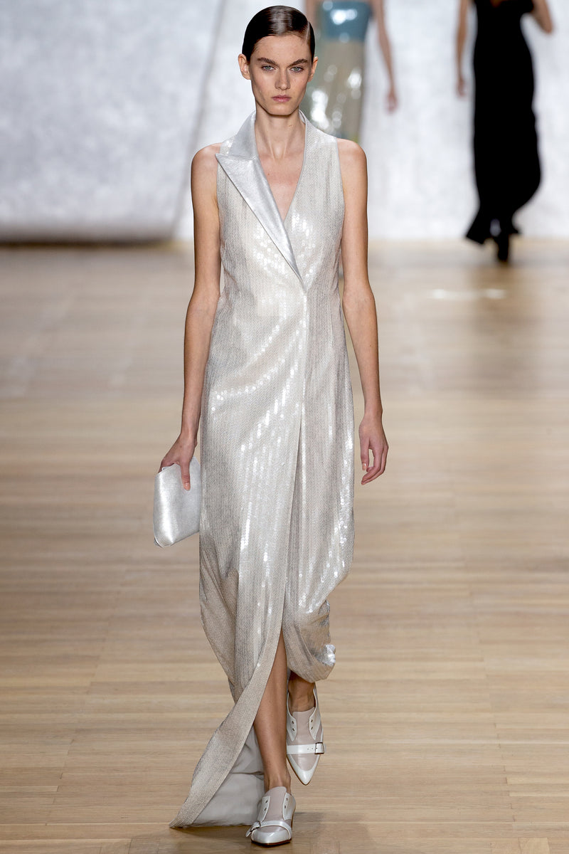 Immer wieder hat Calderara diesen Moment am Ortassee im Piemont in Norditalien festgehalten, wo er lebte. Dieses spektakuläre Licht spiegelt sich in schillernden Pailletten und funkelnden Stoffen wider, die den Charme von Akris neu erlebbar machen."
