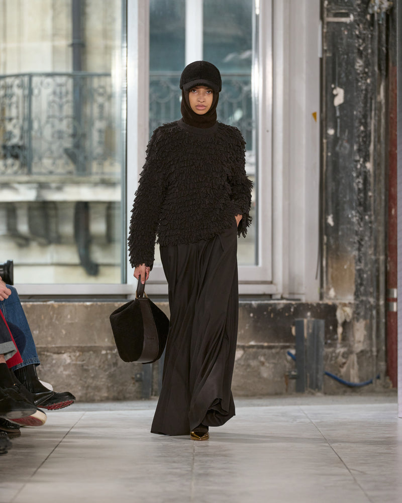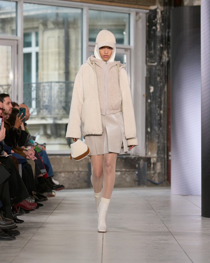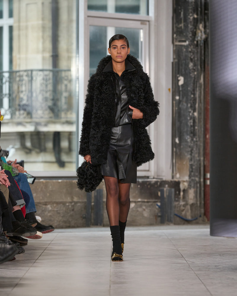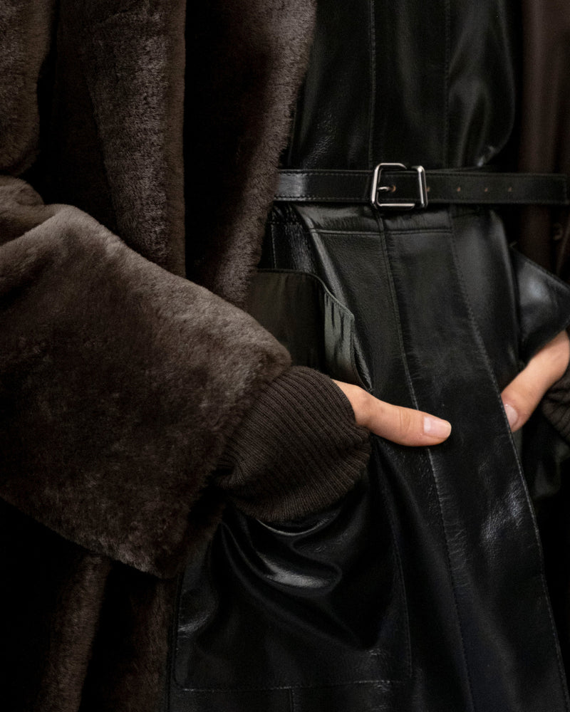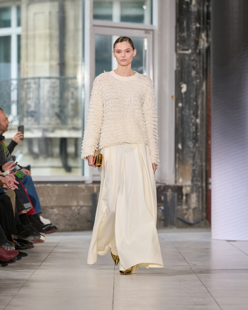 Die Kollektion reflektiert diese Kontraste auch in den Texturen. Strickpullover aus Cloud-, Filz- und Bouclé Kaschmir bieten eine reiche Haptik. Pragmatischer Baumwollgabardine trifft auf weiches Shearling. Anmut zeigt sich in einer wellenförmigen Corsage, während lackiertes Leder und Spitze die Kollektion ergänzen. Leichter Organza sorgt für ein Gefühl von Schwerelosigkeit.