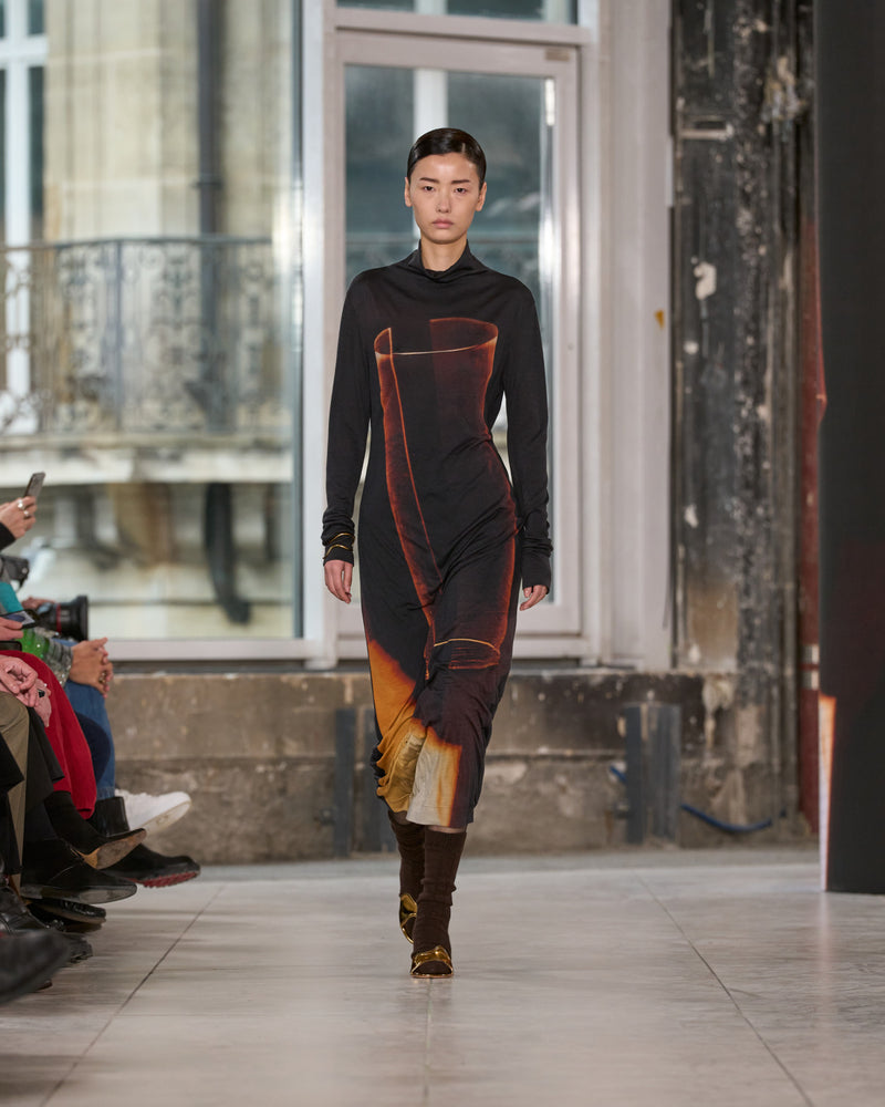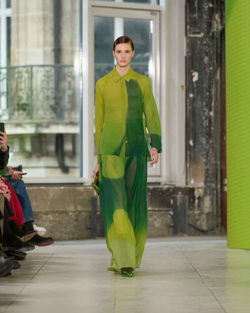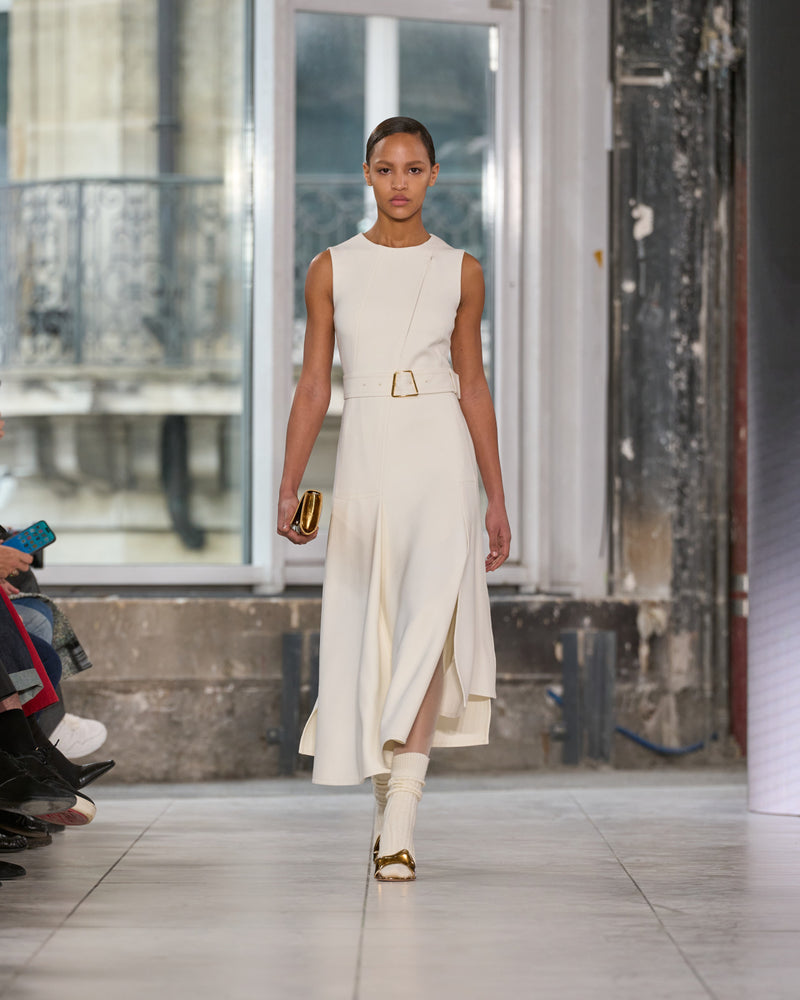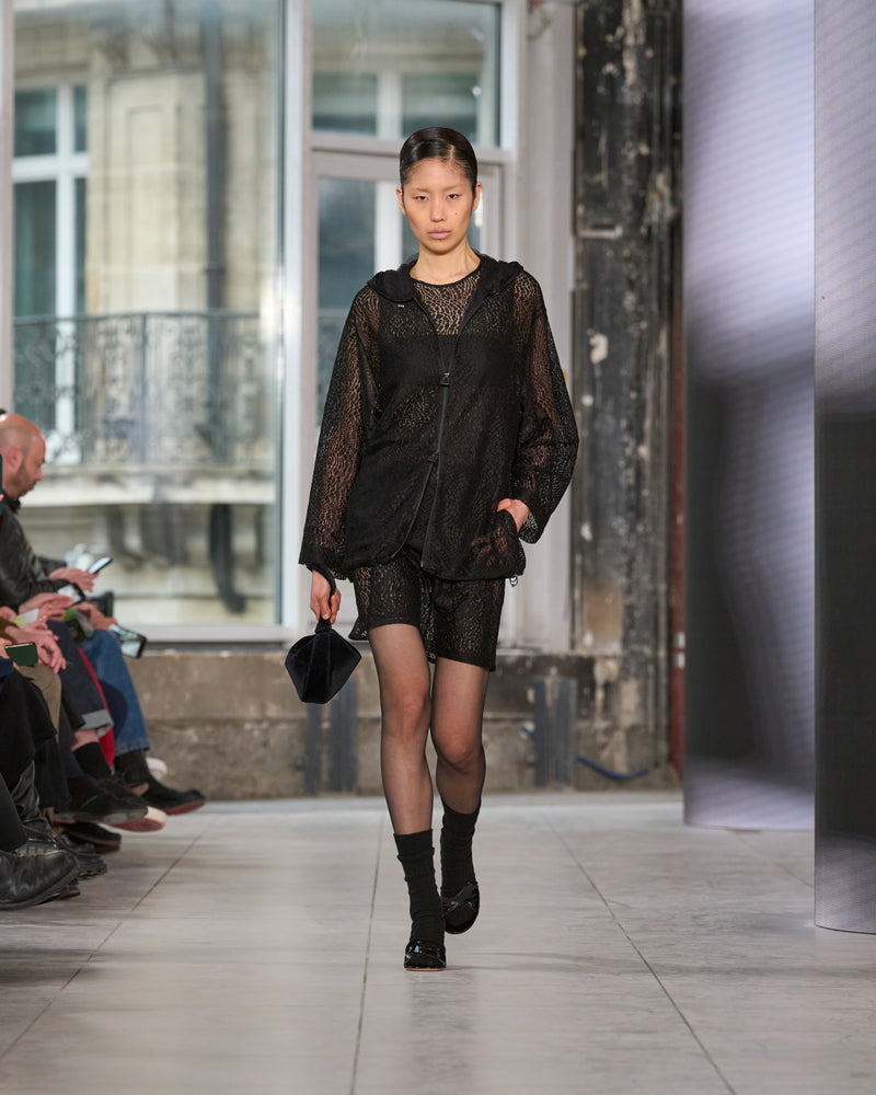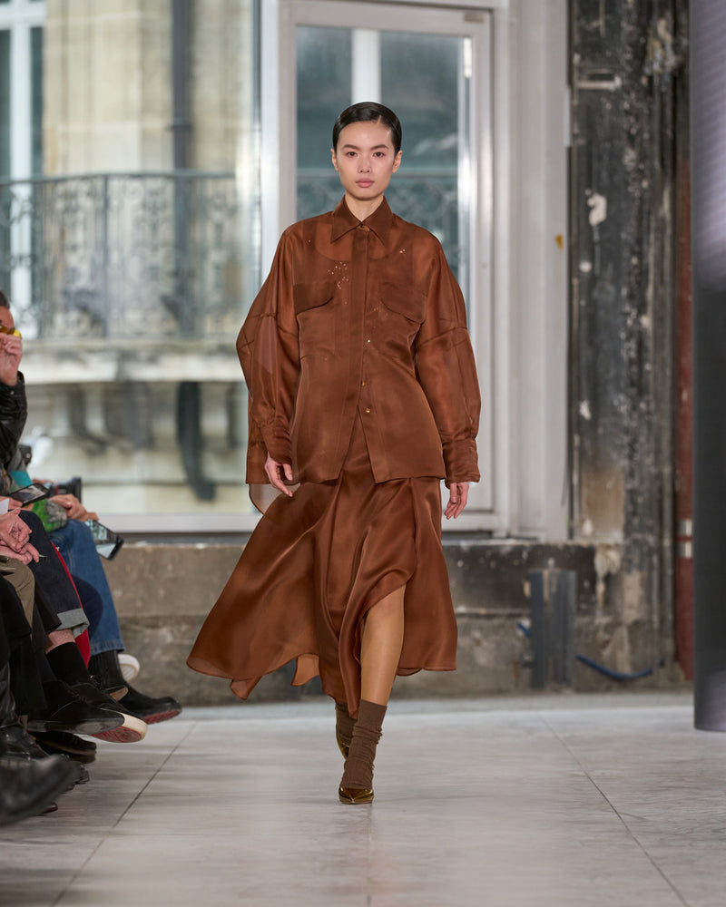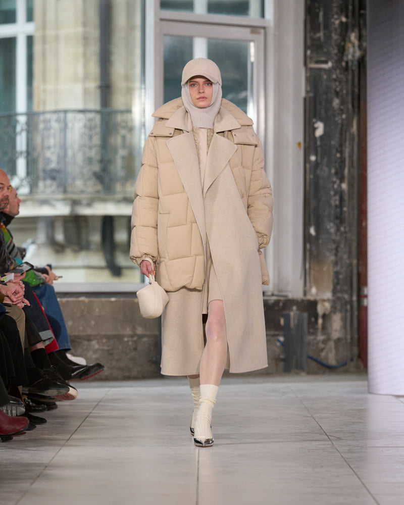 Die Kollektion reflektiert diese Kontraste auch in den Texturen. Strickpullover aus Cloud-, Filz- und Bouclé Kaschmir bieten eine reiche Haptik. Pragmatischer Baumwollgabardine trifft auf weiches Shearling. Anmut zeigt sich in einer wellenförmigen Corsage, während lackiertes Leder und Spitze die Kollektion ergänzen. Leichter Organza sorgt für ein Gefühl von Schwerelosigkeit.