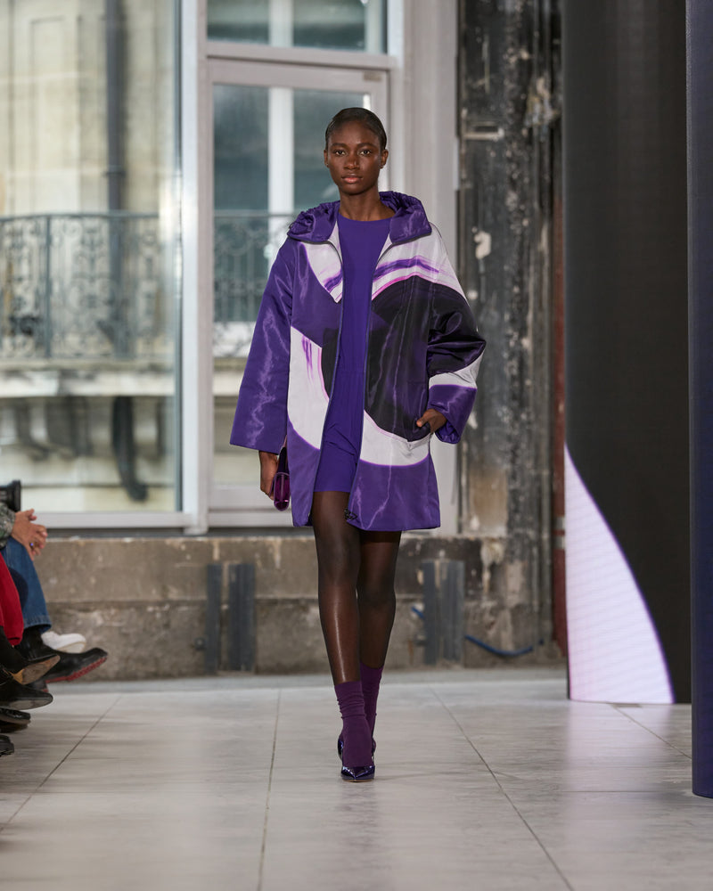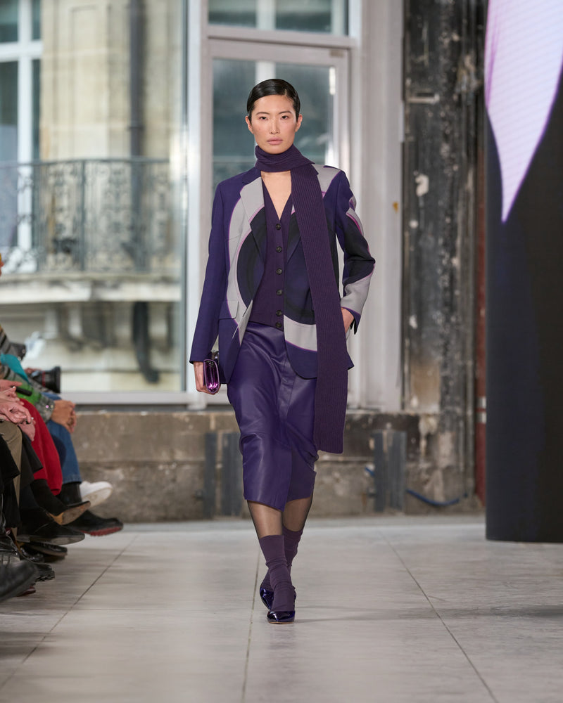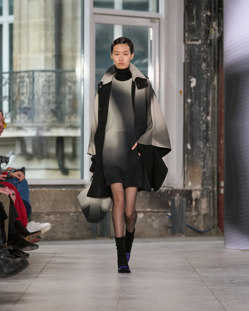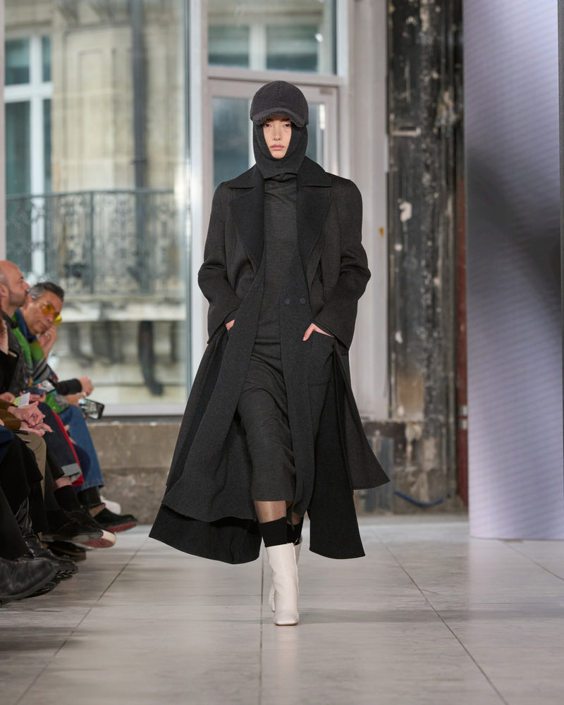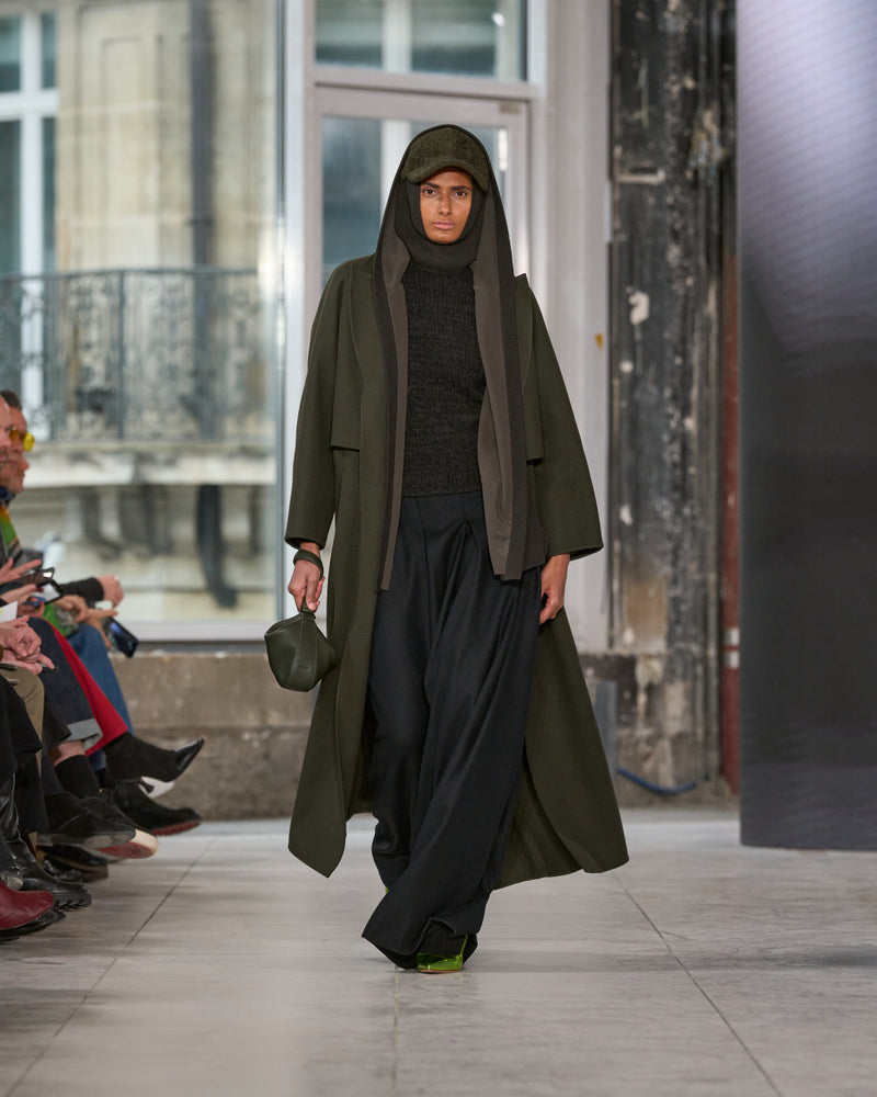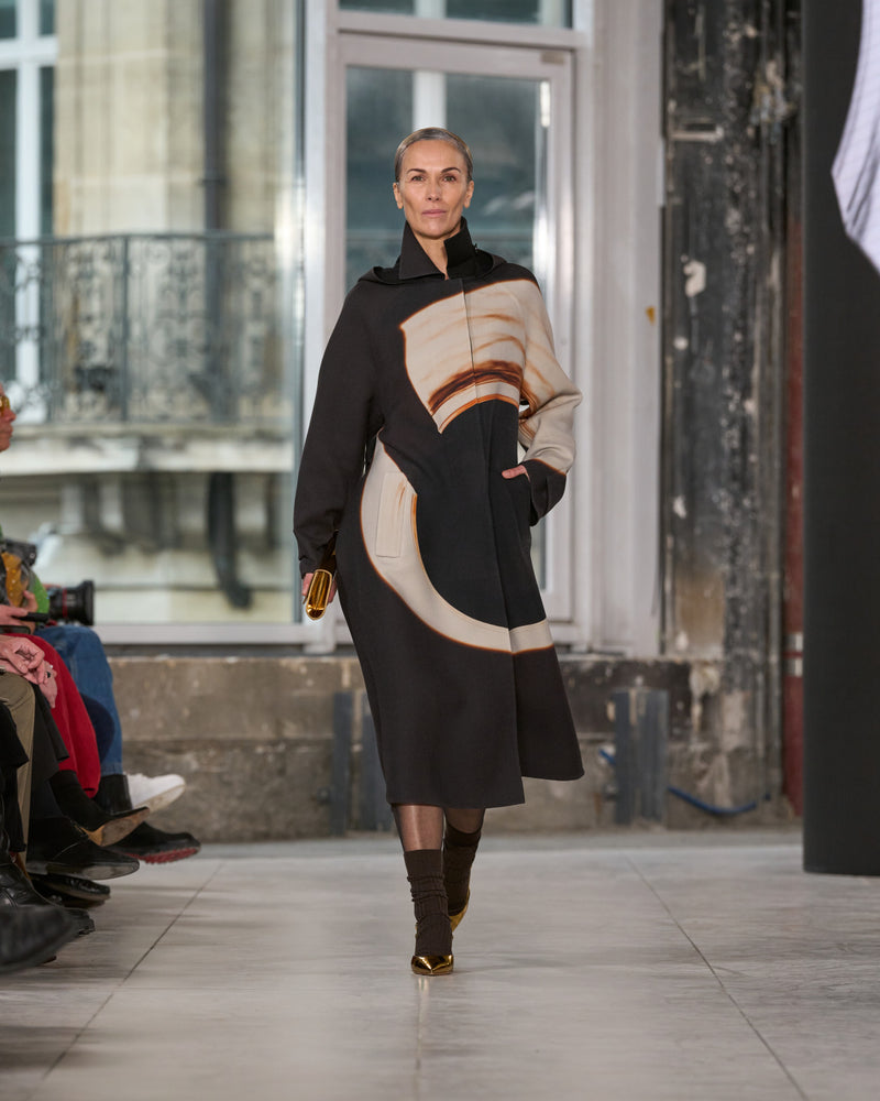 Akris Fall 2024 reflektiert die Dualität und das facettenreiche Leben der modernen Frau. Sie wird je nach Stimmung, Bedürfnis und Moment neu interpretiert: Transformation und Hybridisierung stehen im Mittelpunkt. Ein Mantel verwandelt sich in ein Gilet und eine Jacke. Ein Trenchcoat wird zu einem Kleid. Ein Rock erweist sich bei genauerem Hinsehen als Hose.